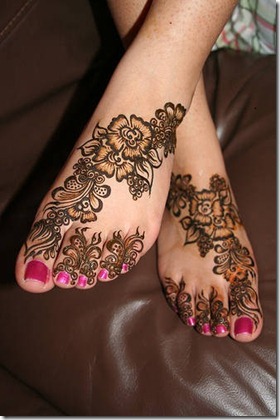 Mehndi designs on foot along with the hands too. The designs and the way of applying mehndi on foot is very different that that of hands. The mehndi is gently designed over the upper side of the food. The women who designs mehndi over her foot should not walk until the mehndi dries in order to prevent the design from getting spoiled.